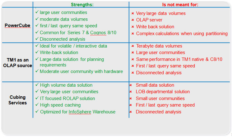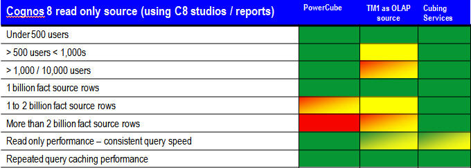 It is certainly important to be aware of the frequency & type of reporting required by the user community, as well as the size and geographic location of the user community (e.g. centralised or decentralised). It also worth noting that Cognos internal testing clearly demonstrated that Powercubes scaled very well with increasing concurrent user volumes, whereas TM1 cubes did not.