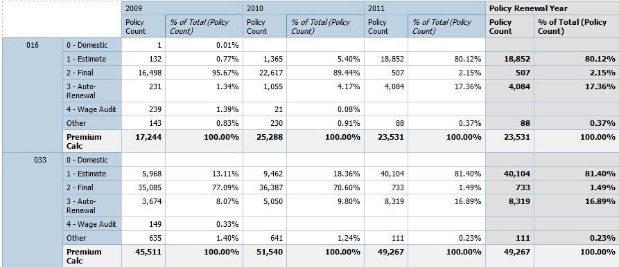 In the following example, we are looking to create a sectioned report, showing % of total for each column in the report. Starting in Analysis Studio, we have a crosstab like this: