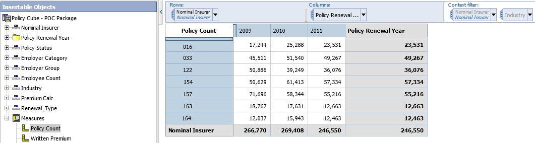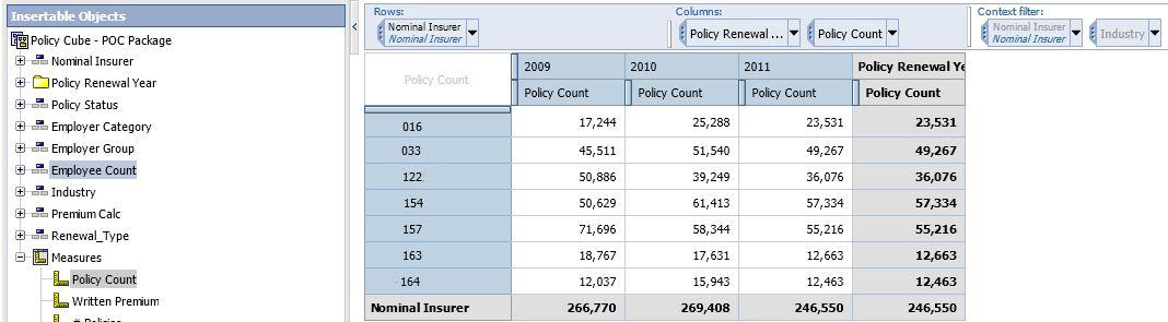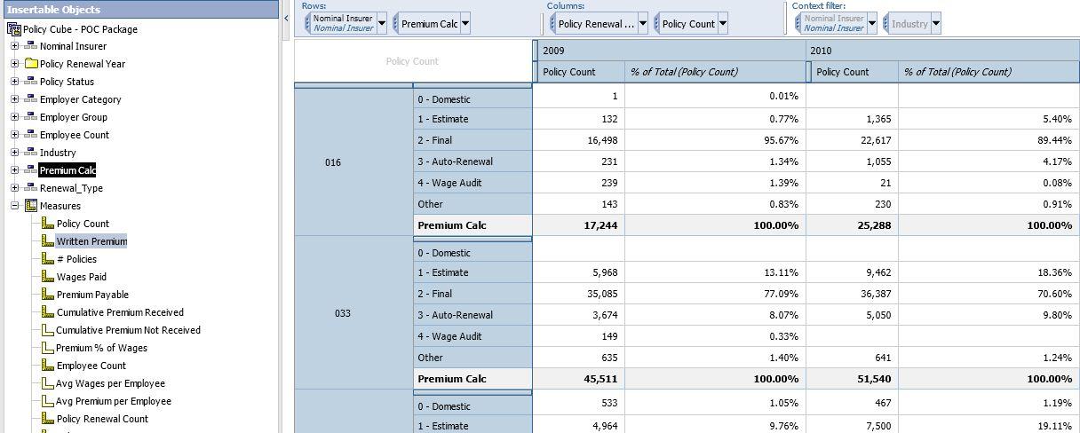 A common requirement is to be able to product % of total or ‘% of portfolio’ reports, for comparative analysis. Unfortunately, this capability is currently missing in Business Insight Advanced. A workaround exists, which is to use the ‘% of’ calculation provided in Business Insight Advanced to hard-code the total value. However this introduces excessive report maintenance implications.